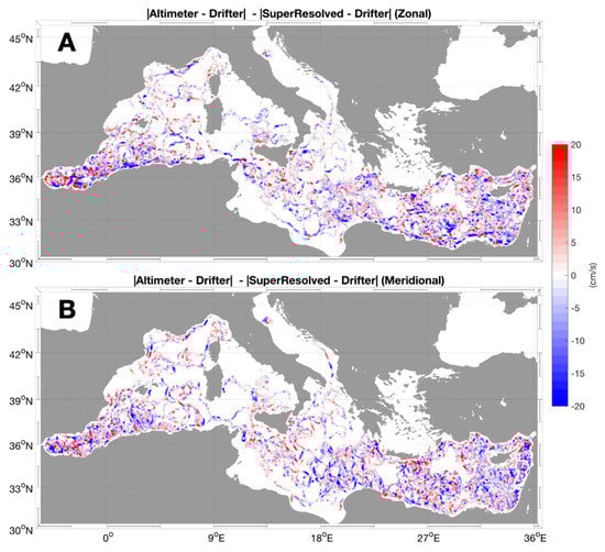 Performance of dADR-SR reconstruction of the geostrophic currents with respect to standard altimeter L4 data along drifter trajectories. The plots show the difference between the absolute error of altimetry and that of super-resolved currents, estimated vs the drifter velocities: (A) zonal component; (B) meridional component. Positive values indicate an improvement with respect to altimetry.