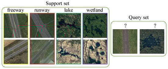 The methods mentioned above mainly focus on applying transfer knowledge or meta-knowledge to address the task of few-shot scene classification, while overlooking the significance of learning distinctive feature representations. Differing from common natural images, remote sensing images have some unique attributes, such as some differences between images belonging to the same category and certain similarities between images belonging to diverse categories, as indicated in Figure 1. It shows a four-way two-shot classification scenario, which contains four different scenes, freeway, runway, lake, and wetland, and two images for each scene in the support set. For few-shot scene classification tasks, due to illumination, background, distance, angle, and other imaging factors, there are various class-irrelevant noises and there are few samples available for each class, which can easily cause confusion in scene classification, while increasing the difficulty of classification. Accordingly, increasing the discrimination and robustness of scene features is a vital line of thinking to improve scene classification performance with finite labeled samples.