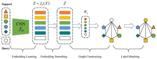 To imitate the way of human learning, an emerging research direction has appeared, namely few-shot learning, which aims to enable the model to rapidly learn to identify new categories from a small amount of labeled data [,]. Recently, some work adopted transfer learning or meta-learning ideas to solve scene classification tasks with a small amount of labeled data. Zhai et al. [] proposed a meta-learning model for the scene classification task, referred to as LLSR, to quickly achieve scene classification with limited samples. There is also some work exploring the usage of graph representation to address the image classification problem with limited labeled data. To generalize matching-based methods, Garcia et al. [] introduce a neural network model based on the graph, which aims to view learning as the transfer of messages from the training data to the test data.