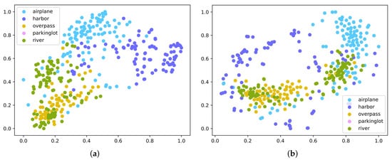 Embedding feature visualization of GES-Net (a) and TPN (b) on UC Merced in the 5-way 1-shot scenario.