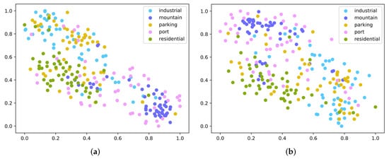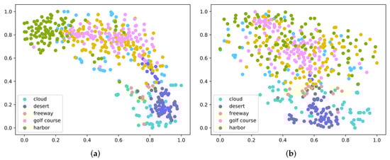 As indicated in Figure 1, the proposed method was carefully designed to solve the scene classification problem of only a few labeled samples and learn an embedding space that enables maximization of the gap between features of diverse categories and minimization of the gap between features of the same category to enhance the discrimination between sample features. Consequently, when there are unseen scene categories with one or five samples, scene classification can be achieved through the above idea. To verify this viewpoint, the five-way one-shot scenario was selected as the testing environment, and the test set was input into GES-Net and TPN []. TPN is one of the most influential few-shot learning approaches based on graph representation, which adopts label propagation to calculate label information for query samples. To illustrate the experimental results more intuitively, three subsets with five classes and one sample per class were individually sampled from the three datasets. T-SNE [] was then adopted to visualize the experimental results on three datasets, namely UC Merced, WHU-RS19, and NWPU-RESISC45, as indicated in Figure 4, Figure 5 and Figure 6. It was noticed that the proposed GES-Net showed excellent results and was more discriminative than TPN in the embedding space, even though it had the phenomenon of separation between classes. Especially for the experiments on NWPU-RESISC45, the advantages of our GES-Net were more clearly shown; that is, samples belonging to diverse categories were more scattered and samples from the same category were more aggregated in the embedding space, which made the decision boundary more prominent. By comparison, samples from different categories embedded by the TPN algorithm were randomly distributed across the entire embedding space, and the decision boundaries among the diverse categories were quite blurred.