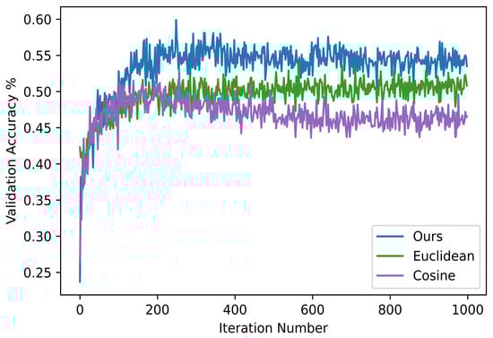 In addition, to measure the similarity degree between samples in the embedding space, Equation (6) was adopted in our proposed method. To illustrate the advantages of the metric we adopted, two commonly used metrics, that is the Euclidean distance and cosine distance, were utilized for comparison. Comparative experiments on NWPU-RESISC45 in the setting of the five-way one-shot scenario were carried out, as shown in Figure 7. It was observed that our proposed approach had a faster convergence rate, while obtaining higher classification performance as the number of iterations increased. Hence, the distance metric that we adopted was significantly superior to the more commonly used Euclidean distance and cosine distance.