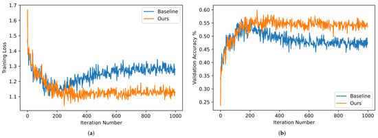 Training loss and validation accuracy on the NWPU-RESISC45 dataset in the setting of the 5-way 1-shot scenario. The training loss is shown on the left, and the validation accuracy is shown on the right. (a) Training loss; (b) validation accuracy.