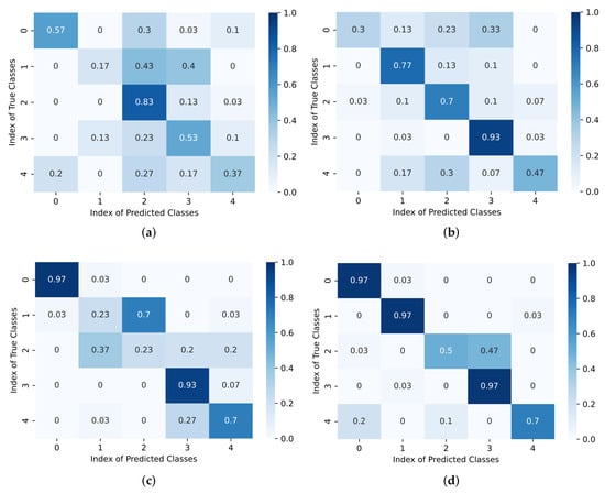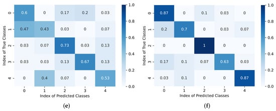 Additionally, the experimental results were also measured in the confusion matrix. Figure 10 shows the confusion matrices for the three public datasets in the settings of the five-way one-shot and five-way five-shot scenarios. By comparing the left and right confusion matrices, it was observed that as the quantity of labeled samples per class increased, the confusion errors decreased and the accuracy of each class increased. This shows that as the quantity of labeled samples per class increased, the performance of our model also increased accordingly.