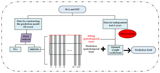 At the time of prediction, a certain proportion of MEEOFs are retained based on the significant test results [31] and divided into two parts: the fitting spatiotemporal basis and the prediction spatiotemporal basis. The weight coefficients can be obtained by projecting the observational data from the independent test sample onto the fitting spatiotemporal basis; then, this set of optimal weight coefficients can be combined with the prediction spatiotemporal basis to obtain the final prediction field. The details are explained in Section 2.4.