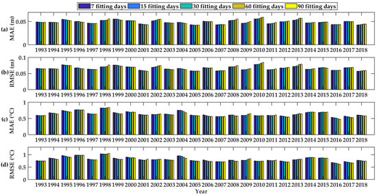 Spatial and temporal average forecast results for different fitting days—(a,b) for SLA; (c,d) for SST.