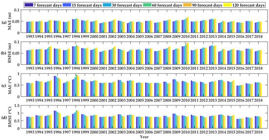 Then, we investigate the performance of different forecast days. Based on the above results, we adopt 24 MEEOFs, and the number of fitting days is fixed at 60 days. The forecast performance for 7, 15, 30, 60, 90, and 120 days are compared in Figure 4, which shows the MAEs and RMSEs of SLA and SST at different forecast times. As can be seen from Figure 4, the changes in MAEs and RMSEs are relatively gentle as the forecast window is extended. The above conclusions hold for both SSHA and SST. We conclude that this prediction model has a potential advantage for intra-seasonal prediction. For the prediction of SLA, based on the MEEOF model, the spatial and temporal averaged MAEs from start time to 7, 15, 30, 60, 90, and 120 days are 0.0465 m, 0.0469 m, 0.0480 m, 0.0490 m, 0.0497 m, and 0.0502 m, respectively. At the same time, the corresponding RMSEs are 0.0629 m, 0.0636 m, 0.0649 m, 0.0664 m, 0.0676 m, and 0.0680 m, respectively. For the prediction of SST, the spatial-temporal average MAEs from start time to 7, 15, 30, 60, 90, and 120 days are 0.635 °C, 0.634 °C, 0.638 °C, 0.628 °C, 0.620 °C, and 0.615 °C, respectively. The corresponding RMSEs are 0.807 °C, 0.804 °C, 0.807 °C, 0.795 °C, 0.785 °C, and 0.780 °C, respectively. Considering the experimental results of these two sea surface variables, we chose 90 days for forecasting.