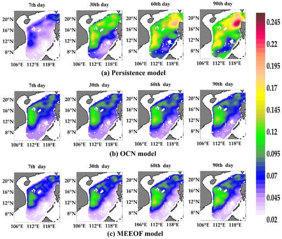 The RMSEs of SLA forecasts validated at the 7th day, 30th day, 60th day, and 90th day are shown in Figure 5. Comparisons of the three models in Figure 5 show that the MEEOF prediction model outperforms the persistence and OCN forecasts over the 90-day forecast horizon. Although the persistence forecast has a small error at the beginning of the forecast window, its error grows rapidly as the forecast time increases, while the MEEOF model and OCN predictions remain largely stable throughout the entire forecast window. In particular, the error of the MEEOF model grows very slowly with the extension of the forecast window and is always smaller than that of the OCN model. This is also true for the SST forecasts (see also Figure 6). Thus, it can be concluded that the predictive capability of the MEEOF prediction model has an obvious advantage over persistence prediction in the mid- and long-term, and it outperforms the OCN prediction model throughout the entire forecast period.