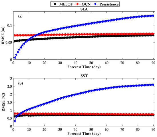 The basin average RMSEs of the MEEOF prediction model, persistence forecasting, and OCN model—(a) SLA; (b) SST.