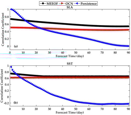 To evaluate the model’s forecast performance in the SCS, we conduct daily forecast experiments for SLA and SST. To ensure the reliability of the experimental results, we perform a round-robin experiment, i.e., the EEOF analysis is performed for any 25 years of data and then validated with another year of data. To better illustrate the superiority of the MEEOF model, persistence forecasting and the OCN model are used as comparisons, and RMSE and CC are used as the evaluation criteria; the comparison results show that the MEEOF model has a stable forecast performance in the forecast range of 15–90 days, and the rising trend of error is much slower. At the end of the forecast window, the RMSE and CC of the MEEOF model for SLA are 0.0703 m and 0.54, respectively; the RMSE and CC for SST are 0.680 °C and 0.66, respectively, which are better results than those using the persistence and OCN models.