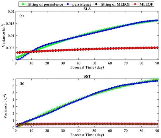 Fitting the errors of the persistence model and the MEEOF model forecasts, the fitted variances of SLA and SST can be obtained as follows: