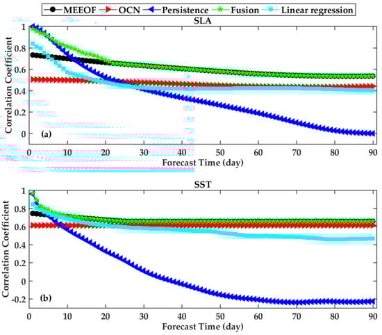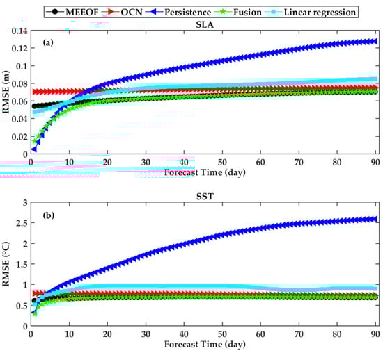 Comparison of forecast RMSEs from the fusion model using persistence prediction, the OCN model, the MEEOF model, and the linear regression model—(a) SLA; (b) SST.