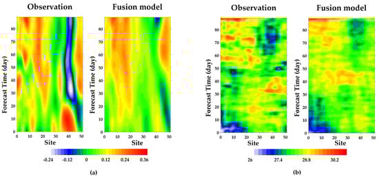 The time-station map of the observation field and forecast field by fusion model from 9 May 2018 to 6 August 2018—(a) represents SLA and (b) represents SST.