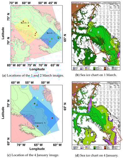This paper presents a case study of the Davis Strait. The investigation area was close to Buffin Island in the Canadian Arctic. Under the effects of different water masses and ocean currents, the sea ice in the Davis Strait displays strong seasonal variation that has a further influence on local light, stratification, nutrient availability, and temperature []. Despite the decrease in global sea ice in the past 25 years, the sea ice coverage in this area has increased []. In general, sea ice appears at the Davis Strait in mid-October and its extent reaches the maximum value in March []. From late July to early August, the ice thickness and coverage rapidly decrease to an ice-free state []. At the acquisition times (21:21 (UTC) 4 January, 21:29 (UTC) 1 March and 22:11 (UTC) March 2) of the RCM images used in this study, the mean air temperature was around −24 C to −25 C, and air temperature was below 0 C for several months. However, since this area is well known for its available fisheries and rich oil and gas resources, the presence of sea ice poses a serious threat to the local economy []. Therefore, near real-time sea ice detection and mapping is of great significance to local economic activities.
