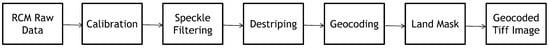 SAR data need to be preprocessed to enhance the data quality and meet different application requirements, for example, mitigating the noise from reflection and geometric distortion caused by terrain changes. Figure 2 displays the preprocessing steps for dual-polarized RCM images. The Sentinel Application Platform (SNAP) [], developed by the European Space Agency (ESA), contains various free open source toolboxes for earth observation missions. In this paper, SNAP was employed to implement most preprocessing steps except destriping.