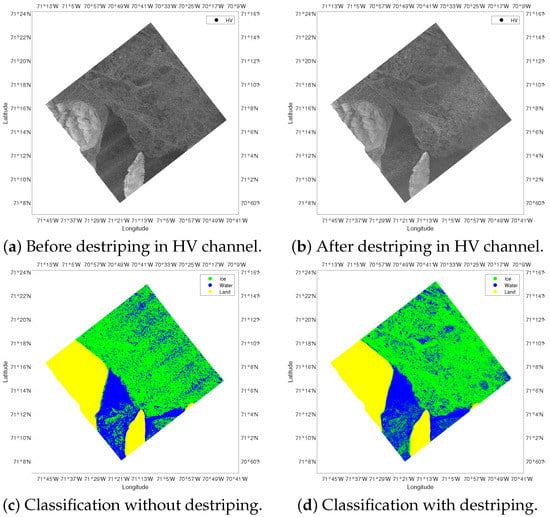 Thermal noise is an additive background energy, and it varies along both the range and azimuth axes and is exhibited as alternating extraordinarily bright or dark stripes in SAR images []. In addition to conventional SAR preprocessing steps, destriping is implemented as an extra step between speckle filtering and geocoding since thermal noise can significantly affect pixel-based sea ice classification. Note that the thermal noise in the HV channel is more evident than the HH channel in a linear polarized SAR image. Thus, destriping is only applied to the RCM HV channel here. Destriping is applied to each pixel of the RCM HV channel through subtracting an intensity offset and then dividing by a gain factor []. Figure 3a,b illustrate the images before and after applying destriping. As can be seen, the stripes of the HV channel are partially successfully removed after destriping. As shown in Figure 3c, ten-thousand samples for each class are used for training in this example. The blue pixels in the large green region are thermal noise and they are classified as water if destriping is not applied, but are classified correctly in Figure 3d.