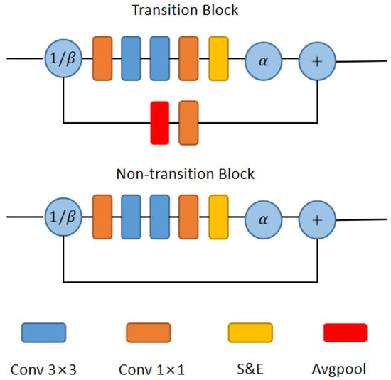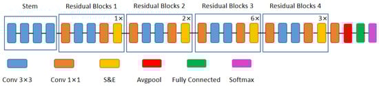 The NFNets were realized based on the SE-ResNeXt-D model with Gaussian error linear unit (GELU) activations here, and its structure is displayed in Figure 4. GELU activation layers were omitted between convolutional layers. The model starts with a stem, a set of plain convolutional layers without skip connections before the residual blocks. The stem comprises a 3 × 3 stride 2 convolution with 16 channels, two 3 × 3 stride 1 convolutions with 32 and 64 channels and a 3 × 3 stride 2 convolution with 128 channels. After the stem, the numbers of blocks for four “residual” stages are 1, 2, 6 and 3, respectively. In order to train deep ResNets without normalization, NFNet uses two scalers ( and , see Figure 5) to suppress the scale of the activations. The residual stages begin with a transition block, followed by standard non-transition blocks. The difference between transition and non-transition blocks is that transition blocks downsample with a 2 × 2 average pooling layer on the skip path and change the output channel count via a 1 × 1 shortcut convolutional layer. After these residual blocks, a 1 × 1 expansion convolutional layer is applied to double the channel count; then, global average pooling is adopted. The final layer is a fully connected classifier layer. The original fully connected layer outputs a 1000-way class vector. In our study, we replace the final layer with a layer that outputs a three-way class vector to match the sea ice types. At last, the fully connected layer outputs are softmaxed in order to obtain normalized class probabilities. All convolutions employ scaled weight standardization, whereas the squeeze-and-excitation layers and fully connected layers do not adopt it. The configuration of each layer is specified in Table 3.
