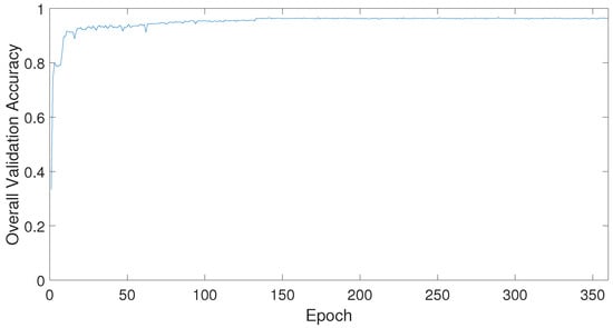 The training strategy of the NFNet-F0 was basically the same as that in []. Softmax cross-entropy loss was used with label smoothing of 0.1. Stochastic gradient descent was applied with Nesterov’s momentum coefficient of 0.9 and a weight decay coefficient of 0.00002. The learning rate warmed up from 0 to its maximal value of 0.05 over the first five epochs (iterations). After the warmup, the learning rate was cosine-annealed to zero. AGC was set with for every parameter except the fully connected layer. An exponential moving average was implemented with a decay rate of 0.99999 and followed a warmup schedule where the decay was equal to , where t was the number of iterations. The batch size was set as 128. For the training process, 70% of samples were used to train the model, and 30% of samples were used to evaluate the model’s generalization ability. Three hundred and sixty epochs were executed to train the model. Figure 6 shows the validation accuracy changes with epochs during the training process. After about 130 epochs, the validation accuracy of the model tended to be stable. The model with the best validation accuracy was obtained for subsequent classifications.