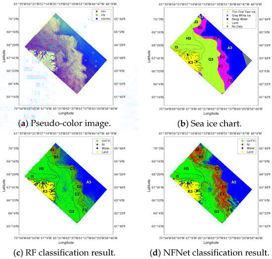 Table 5, Table 6 and Table 7 show comparisons of the sea ice chart data, the RF and NFNet results. In these tables, the “area ratio” represents the ratio of the area of a polygon (which may be incomplete) in an RCM image to that of the corresponding complete polygon in the sea ice chart. A higher area ratio for a polygon means that the data for this area shown in the RCM image are more representative than those of the complete polygon.