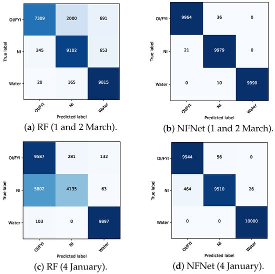 Figure 7, Figure 8 and Figure 9 illustrate the analysis results for 1 March, March 2 and 4 January, respectively. The green rectangles in Figure 7a were used for selecting the training samples for OI/FYI. The red and white rectangles indicate the areas used for selecting the training and testing samples of NI and water, respectively, and their testing samples were located far away from corresponding training samples, as mentioned in Section 3.4. The green rectangles presented in Figure 8a were used for extracting the OI/FYI samples for the first testing set. Ten-thousand samples for each class of the second testing set were obtained from the rectangles displayed in Figure 9a. Compared to the training samples, the corresponding second testing samples were taken from a different time (4 January) and different regions. All the testing samples for the two techniques were the same. The RF method’s overall accuracy and the kappa coefficient of the first testing set were 87.42% and 0.8113, respectively. For the NFNet classification, the first testing set’s overall accuracy was 99.78%, and the corresponding kappa coefficient was 0.9967. As for the second testing set, the RF’s overall accuracy and kappa coefficient were 78.73% and 0.6895, whereas NFNet’s overall accuracy and kappa coefficient were 98.18% and 0.9727. Although different data sets and cover types were used, the overall accuracies of RF (87.42% and 78.73%) and NFNet (99.78% and 98.18%) in this study were close to that of RF (87%) in [] and VGG-16 (99.89%) in []. The corresponding confusion matrices are displayed in Figure 10. For the first testing set (see Figure 10a,b), no ice samples were misclassified by the NFNet as water. For the RF model, the classification accuracy for water was only 87.96%, which means that more ice samples were misclassified as water. Moreover, the recall of OI/FYI was 73.09%. For the two-level RF model, OI/FYI was classified at the second level, distinguishing OI/FYI and NI from ice samples. The poor recall for OI/FYI indicates that many OI/FYI samples were misclassified as NI. Figure 10c,d illustrate the confusion matrices of the two models for the second testing set. It can be seen that the accuracy of the NFNet for NI only dropped slightly. The 100% accuracy for water displayed by the NFNet may be because these water samples were very far from the main ice area. Only 41.35% of the NI samples from the second testing were correctly classified for the RF method, and more than half of the NI samples were misclassified as OI/FYI.