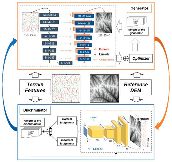 Further development of CGANs has been presented to promote the control efficiency of the input condition. The Pix2Pix architecture [35] is developed based on CGAN to learn a function to ‘translate’ the map from an input image to an output image. The most significant improvement of Pix2Pix net is the changing of the introduction of concatenation, which helps to retain original feature of input image and utilize the user-defined conditions [35]. The improved architecture has been proven to achieve more satisfactory results compared with typical CGANs in the field of background masking, image translation [35,50,51], etc. Therefore, to achieve the detection of correct topographic features from the input condition and generate the output that conforms to the specific landform, Terrain-CGAN is inspired by the above architectures and previous studies focusing on terrain generation [27,28]. In Terrain-CGAN (Figure 3), the basic structure of the Pix2Pix network is retained to achieve the efficient learning of topographic characteristics. The input data of Terrain-CGAN correspond to the sample unit we constructed in Section 2.2.2. The terrain features, including ridge lines, gully lines, and areas of positive terrain, are regarded as the input data to guide the learning process. The corresponding DEM in each sample pair is used as the target of the generating process, which means that the model is encouraged to construct a simulated DEM and make it similar to the referenced DEM. At the end of the training process, the trained model can extract topographic information from the input features and build a DEM that can express the terrain it learned. We set the learning rate to 0.0002 and selected Adam as the optimizer in Terrain-CGAN. The final model is completed after 500 epochs, which consumes approximately 8 h.