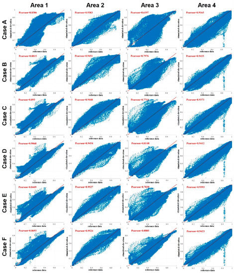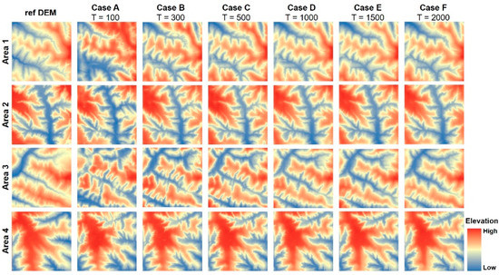 In this section, we map the elevation relation between the reference data and the generated results and calculate the Pearson correlation coefficient (Figure 6). The high coefficient indicates that the simulated results include topographic characteristics similar to those of the reference data. The coefficients in Areas 1, 3, and 4 are all greater than 0.8, which reflects the strong positive correlation between the generated results and the reference data. In addition, the Pearson coefficient tends to increase with increasing threshold. Cases D, E, and F generally achieve higher coefficients than Cases A, B, and C, which is consistent with what we observed in Section 3.1. However, Area 3, which includes broken ridges in Figure 5, contains unsatisfactorily low correlation coefficients. Complex terrain relief could be the primary reason for the unexpected deviation from the reference data.