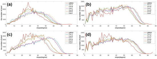 Figure 7 shows the slope of different results. Generally, most results achieved a trend similar to that of the reference data. In Areas 2 and 4, the results of Terrain-CGAN exhibit similar fluctuations to the reference data in the range of 30° to 50°. Meanwhile, Table 3 shows that the Terrain-CGAN can generate a small deviation in the mean slope. In addition, the lowest difference in the mean slope between the generated results and the reference data usually occurs in Case F with the highest threshold. Even though the terrain generated by Terrain-CGAN is close to the reference surface, especially in Areas 2 and 4, several unexpected deviations still exist. For example, in Area 1, Terrain-CGAN fails to construct the peak on the slope curvature (Figure 7a). We think this error around peaks is acceptable given that the overall trend constructed by Terrain-CGAN matches the reference data in most ranges.