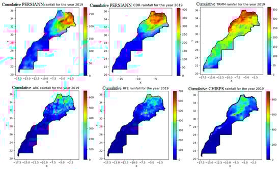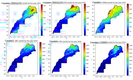 The results of this work have shown that the average annual precipitation of the data availability period (13 May 2007 to 31 December 2019) tilts towards a strong gradient of precipitation between the north and south of the country as precipitation declines southwards. The mean annual rainfall in Morocco decreases from the north to the south as well as from the west to the east, and ranges from more than 500 mm in the northern part, to between 250 mm and 400 mm in the central region, and between 150 mm and 250 mm in the southern region (south of the high Atlas), and less than 100 mm in the Sahara Desert. There are also very important disparities between the various satellite products, as the maximum average annual precipitation varies from 250 mm for TRMM to 1000 mm for CHIRPS (Figure 1). It can be observed that the cumulative precipitation of the wettest year (2010) detected by CHIRPS was (2000 mm), ARC2 was (1600 mm), CDR was (1000 mm), and higher than the values detected by PERSIANN (500 mm) and TRMM (400 mm) (Figure 2). Indeed, the better performance of PERSIANN CDR over PERSIANN can be explained by the bias adjustment of PERSIANN CDR on a monthly scale using GPCP data. Furthermore, the cumulative precipitation rates of the driest year of the study period (2019) maintains the same order as the previous figures with a better performance recorded for the CHIRPS product (900 mm) and a relatively worse performance of TRMM (350 mm) and PERSIANN (250 mm) products. For this dry year (Figure 3), it can be observed that the gaps between the products have decreased and the performance of TRMM has improved compared with 2010 (Figure 2).