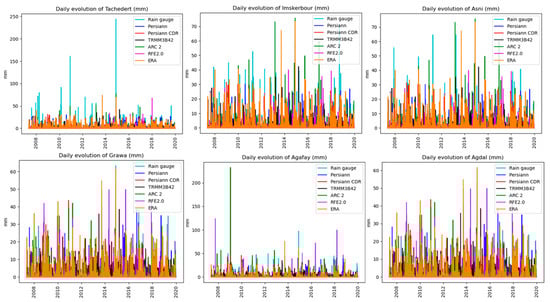 Analyses of one of the wettest years (2014) and the driest year (2019) (Figure S5) show that, for 2014, the observed seasonal variation that was observed earlier is maintained, with two distinct periods (one wet and the other dry) (Figure S5). Furthermore, there is an overestimation of TRMM during the dry period and an underestimation during the wet period. For the wet period (2014), there was an overestimation of CHIRPS, followed by ERA, and then PERSIANN CDR. In most cases, there is an overestimation of the estimated products, except for Tachedert, where most products are underestimated by the weather station data. Moving to the year 2019, the seasonal variations are not respected. Secondly, while the products have no trends, they have a little different response than the weather station records. In addition, CHIRPS and ERA overestimate at different altitudes, while TRMM is more prevailing than the year 2014 especially at low altitude. It can be concluded that daily and monthly satellite products estimate better at low altitude and in wet years (Figure S5).