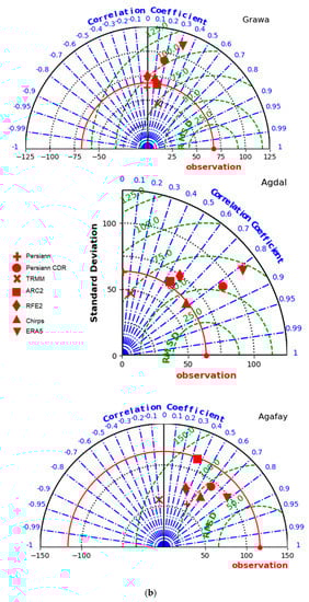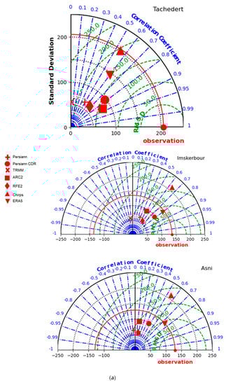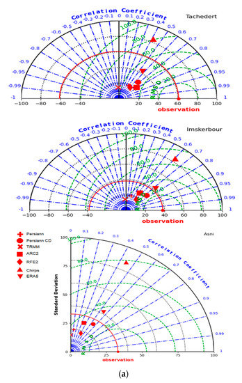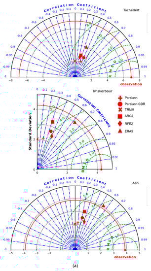 The scatterplots of the relationship between the different satellite products (except for CHIRPS, because its precipitation data are mostly monthly) and the Tachedert weather station (2343 m) precipitation observations (Figure S6) have been presented with the aid of classical metrics (N, Nash; B, bias; RMSE, root-mean-square deviation; R, correlation coefficient; R2, coefficient of determination) (Figure S6). The initial results show that Nash is positive for most of the products except for TRMM (−0.12). However, the positive Nash still presents very low and non-significant values (<0.7). For the bias, all products are negative, which is evidence of their underestimation at the Tachedert weather station, except for ERA, which overestimates the weather station data (0.15). RMSE records values that vary from 6.42 for PERSIANN CDR to 7.36 for TRMM. Regarding the correlation coefficient, PERSIANN CDR correlates the most with weather station observations with R = 0.4 followed by ERA (R = 0.35). On the other hand, TRMM is the least correlated product (R = −0.02). The latter observations are consistent with the coefficient of determination with R2 = 0.161 for PERSIANN CDR and 0 for TRMM (Figure S6). From these results, it can be said that PERSIANN CDR has the best performance for high altitudes. This is confirmed by the Taylor diagrams (Figure 5), which shows that PERSIANN CDR has the highest correlation and the lowest RMSD, but the standard deviation is far from the observation (Red); in this case, the weather station of Tachedert detected precipitation of a very variable intensity (250 mm/d), hence the exorbitant value of the standard deviation.