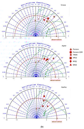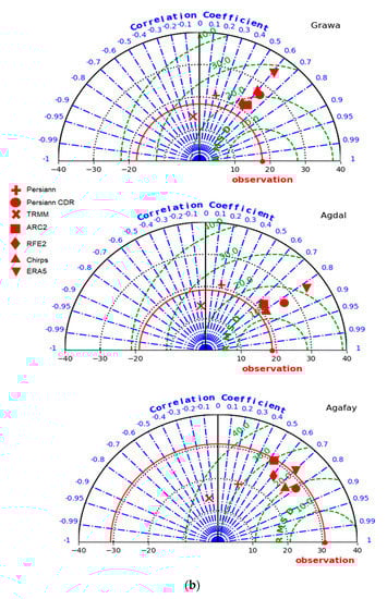 (a) Taylor diagram of the annual precipitation at Tachedert, Imskerbour, and Asni weather stations; (b) Taylor diagram of annual the precipitation at Grawa, Agdal, and Agafay weather stations.