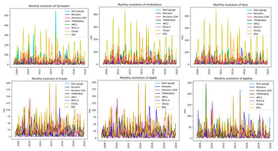 In the context of the temporal evolution of monthly precipitation rates (mm), it is observed that the maximum precipitation varies from 546 mm in 2014 to 56 mm in 2019 for the weather station of Tachedert. Additionally, it is seen that the maximum of the monthly precipitation is more important in high-altitude areas than in low-altitude areas, with maximum intensities that vary from 500 mm in Tachedert (2343 m) to 200 mm in Grawa (550 m) and Agdal (489 m). In contrast to daily precipitation, the monthly estimates are closer to the Tachedert weather station observations, with the notable overestimation of CHIRPS product followed by ERA (Figure 6).