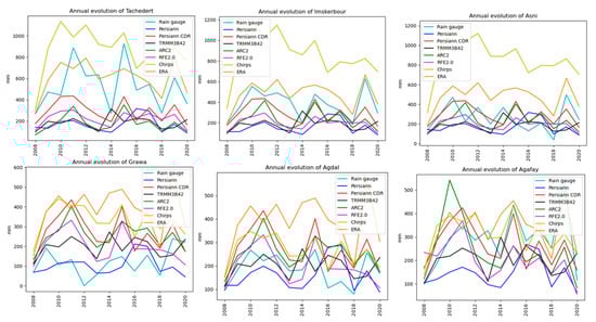 In the context of the temporal evolution of annual rainfall rates from the weather stations and corresponding satellite pixels (Figure 8), it is observed that the annual estimates are closer to the weather station observations at medium altitude (Imskerbour: 1404 m) (Asni: 1170 m), except for ERA and CHIRPS. For high altitudes (Tachedert: 2343 m), most of the satellite products underestimate, except for CHIRPS, and sometimes ERA. A previous study (El Orfi et al. [32]) has reported similar observations, noting that CHIRPS overestimates the rainfall data of weather stations during the rainy season, with positive bias values. For the low altitude (Grawa: 550 m, Agdal: 489 m, Agafay: 487 m) most of the satellite products overestimate the weather station data except for PERSIANN and sometimes TRMM and RFE. On the other hand, for Asni and Imskerbour, most of the products are close to the weather stations observations, except for CHIRPS. Additionally, it is seen that at low altitude, especially for Grawa, TRMM begins to overestimate, because the amplitudes of overestimation during dry periods are more important than the amplitudes of underestimation during wet periods, which are not very frequent due to the arid climate of the Tensift region.