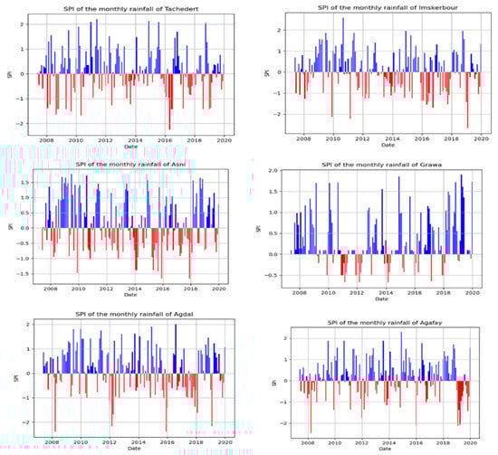 To determine the onset, duration, and magnitude of meteorological drought, the SPI time series is calculated based on the monthly precipitation resulting from the six weather stations for a period of 13 years (from May 2007 to December 2019). The temporal evolution of the SPI is based on the six weather stations in the Tensift basin. Figure 10 shows the initial results; the blue colors represent positive and wet outcomes, whereas the red colors represent the negative and dry periods. Below, we present the observations in each weather station.
