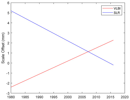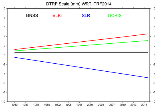 Angermann et al. estimated the difference of VLBI single-technique solutions (intra-technique combination) of DGFI-TUM and IGN by 14 Helmert parameters, and the results showed that there is a linear trend between scales of these two solutions (see Figure 2) [24]. In order to minimize the scale impact for these two techniques, the scale of the ITRF2014 is defined in such a way that there is a zero scale factor (at epoch 2010.0) and a zero scale rate with respect to the average of the explicit scales and scale rates of the VLBI and SLR solutions [13,20]. Therefore, there is a constant offset in Figure 1 with respect to Figure 2.