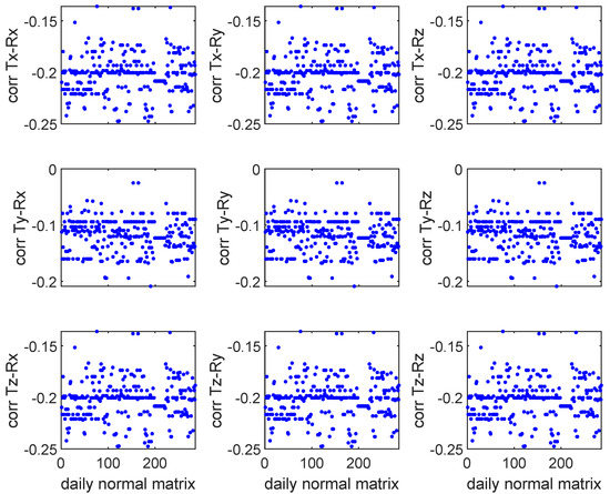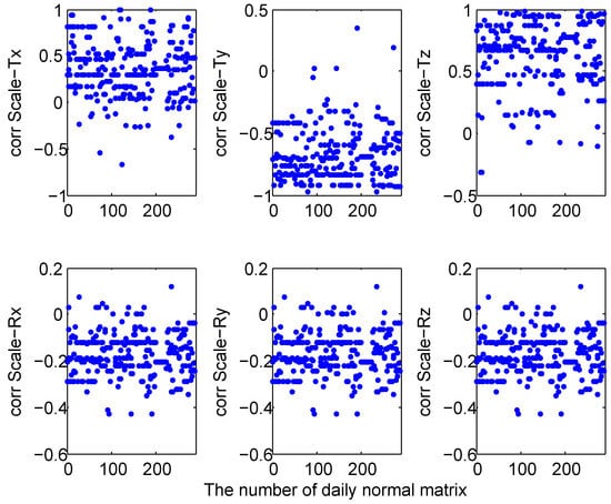 In this section, we will check the correlation between the Helmert parameters of the session-wise NEQs. Firstly, the minimum constrained solutions of NEQs are substituted into the seven-parameter similarity transformation model. Then, the Pearson correlation coefficient between the transformation parameters in each normal equation of the similarity transformation is calculated. Figure 3 shows a strong correlation between scale and translation parameters and a weak correlation between scale and rotation parameters.