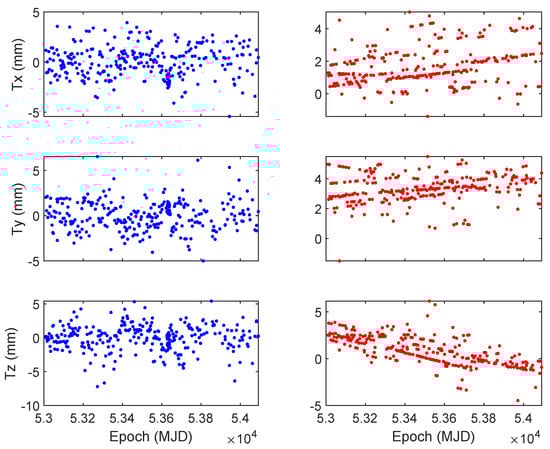 Figure 4 shows the time series of translation parameters with respect to the long-term solutions of tests 1 (blue points on the left) and 2 (red points on the right).