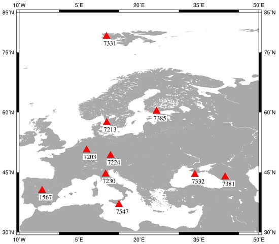 It should be noted that the internal constraints have strict requirements on stations’ coverage of IVS sessions. The poor station coverage of IVS sessions leads to a strong correlation between rotation and other transformation parameters. ITRF2014 has to exclude the IVS sessions without more than four stations and those with poor coverage [13], although the excluded data are not outliers. Figure 6 and Figure 7 show the station distribution of the two excluded sessions, corresponding to a session of no more than four stations and one with regional coverage, respectively.