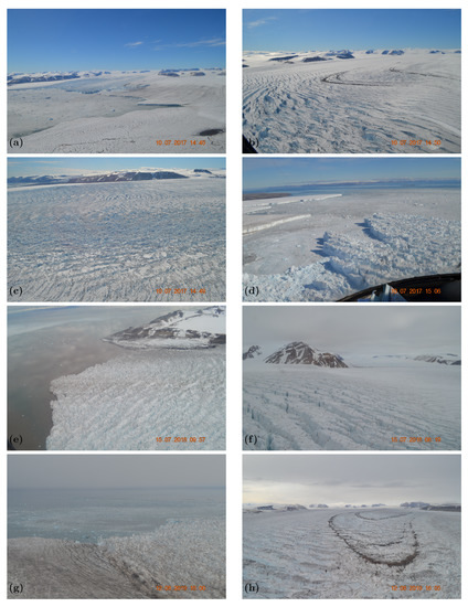 Negribreen during surge in 2017–2019. The multitude of different surface types indicates that a glacier during surge provides an ideal test situation for evaluation of height determination over crevassed and other complex ice surfaces. Photographs by Ute Herzfeld. (a) Negribreen surge July 2017, overview. (b) Wavy crevasses and folded moraines in central Negribreen, July 2017. (c) Several different crevasse provinces in central Negribreen, July 2017. (d) Calving front, ice fingers advancing into the ocean (front right), with smooth surface of non-surging Ordonannsbreen in the back left, July 2017. (e) Crevasse province near calving front July 2018. (f) Blocky crevasses near RGT 594 region, July 2018. (g) Ordonannsbreen-Negribreen boundary near calving front, August 2019. (h) Folded moraines and surge crevasses, August 2019.