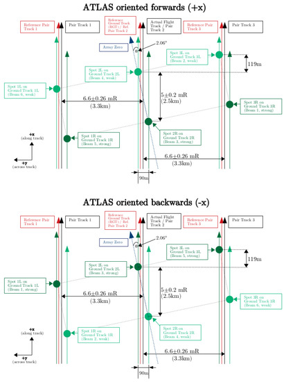 ICESat-2 beam pattern and track geometry. For observatory orientations of ATLAS flying forward (“weak beams leading”) and ATLAS flying backward (“strong beams leading”). Beam numbering is a feature of the transmitter array, while spot and ground track numbering is a feature of the ATLAS data products, see Table 1. (Figure from [3], Figure 3).