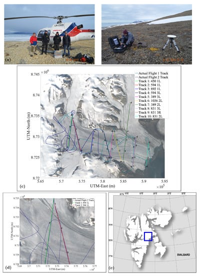 (2) GPS data. Two separate GPS units were used for redundancy. The first, called “Button GPS”, is a low cost, plug-and-play type used for making quick, low-accuracy plots and serves as a backup for the second system. Button GPS was placed on the dashboard of the helicopter, where it had good sky view through the large front window. The second system is a high-cost high-accuracy two-part GPS system, which consists of a base station reference receiver and a helicopter mounted kinematic GPS unit (rover). The base station collects observations including atmospheric delay parameters and orbit information that allow for post-processing that increases the position accuracy of the kinematic GPS unit mounted on the helicopter. Sky view of the base station was unobstructed, because the base station was positioned on an elevated moraine edge or near a cliff edge on the southern side of Negribreen, several hundred meters above the glacier (Figure 3a,b). There were no large mountains obstructing the sky view of the base station. The rover was mounted on one of the skids of the helicopter, and thus the body of the helicopter and the helicopter rotors possibly interfered with sky view of the rover. The instrumentation for the differential GPS data collection was provided by UNAVCO in both years.