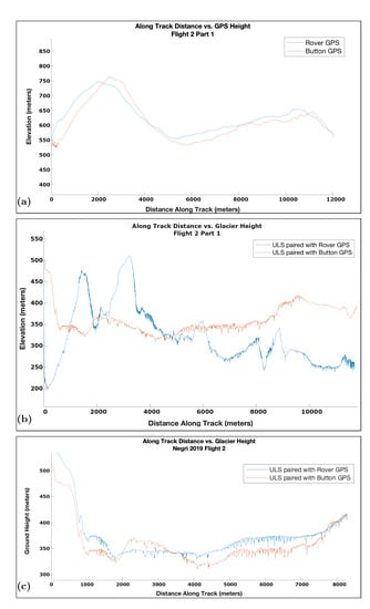 This process is illustrated in Figure 5, which shows heights and times from the two GPS receivers during flight 2. Button GPS recordings appear to be “ahead of” the rover GPS with respect to distance, an effect that results from starting the Button GPS first. Since the Button GPS and ULS laser were being controlled from the same computer, we have exact time synchronization between them. In contrast, the rover GPS was controlled through its internal computer (and a handheld controller), which results in timing independent from that of the ULS laser. The first correction step involved time-shifting the rover GPS to align with the Button GPS/ULS laser (Figure 5).