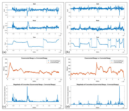 (3) IMU data. IMU data record the attitude of the helicopter during the flights. These data are collected to allow correction for attitude and vibration. The IMU is also owned by our Geomathematics Laboratory and integrated into the survey system. Our post-processing includes coincidently collected IMU data to remove helicopter vibration with a low-pass filter, and to correct for roll, pitch, and yaw with a transformation matrix, taking into account the spatial offset between the mounting positions of the laser altimeter system and the GPS rover on the helicopter.