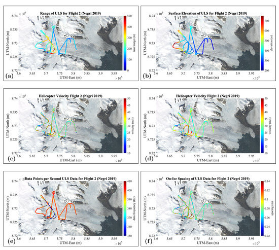 Technical Measurement Results. Following geodetical correction, the 2019 airborne campaign data over Negribreen are analyzed with respect to measurement accuracies and precisions. (4) The Lasertech Universal Laser System (ULS), operated at up to 300 m above ground level, yields full return frequency (400 Hz) and 0.06–0.08 m on-ice along-track spacing of height measurements. (5) Cross-over differences of airborne laser altimeter data are m along straight paths over generally crevassed terrain, which implies a precision of approximately 2.6 m for ICESat-2 validation experiments. (6) In summary, the comparatively light-weight experiment setup of a suite of small survey equipment mounted on a Eurocopter (Helicopter AS-350) and kinematic GPS data analyzed in post-processing using CSRS-PPP leads to high-accuracy repeats of ICESat-2 tracks.