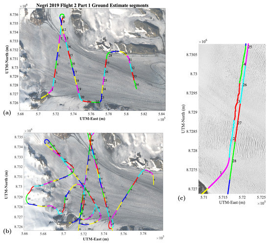 (1) Kinematic GPS data collection with differential correction of rover data with base station data in post-processing yields the highest accuracy of positioning, of our three types of experiments. Experiments on flight-path segmentation indicate that quarter-crossings of the glacier work best, aiming to fly a straight line across a 2–3 km distance. Full glacier crossings are similarly good with respect to resultant accuracy of track repeats and require fewer waypoints to be entered manually by the pilot into his on-board system. Notably, the entire survey setup requires good collaboration and communication between the pilot, the experiment lead (the PI) and the survey team who continuously monitors instrument functionality and height (altimeter range). As a result, full glacier crossings of about 10–20 km flight distance depending on location were used in 2019.