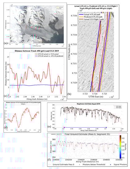 During the 2019 field validation campaign, airborne geophysical data were collected along predicted ICESat-2 ATLAS ground tracks (see, Figure 3c) on 12 August 2019 (Flight 1) and 13 August 2019 (Flight 2). The locations of ground tracks from our flight campaign are referred to as flight tracks, or flight ground tracks (with coordinates calculated as described in this paper). The analysis in this paper utilizes predicted ATLAS ground tracks, actual ATLAS ground tracks and flight ground tracks. A zoom into Figure 3c, seen in Figure 3d, shows the tracks along RGT 450 and RGT 594, which will be analyzed in this paper, their relative location and crevasse types surveyed. Planet SkySat satellite image data, specifically collected to support this project, provide additional information suitable for evaluation of ICESat-2 measurements. Figure 3f shows crevasse provinces near the calving front in a Planet SkySat image taken on 18 August 2019. Extensional wavy crevasses, indicative of the area of highest velocities at time of image capture, dominate the northern central part of Negribreen, north of the trace of a medial moraine in upstream Negribreen. The fast-moving region is flanked by shear crevasses in its north and south, then (in an outward direction from the center) more closely spaced crevasses in the north, followed by smooth, slow-moving ice provinces in the north and south.