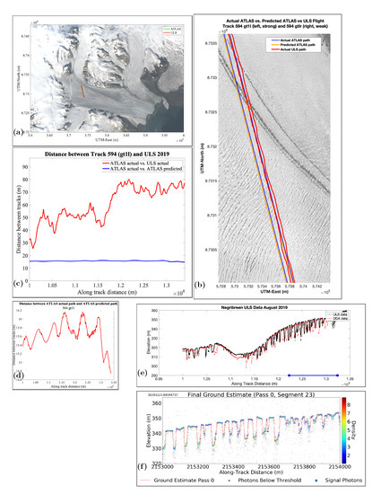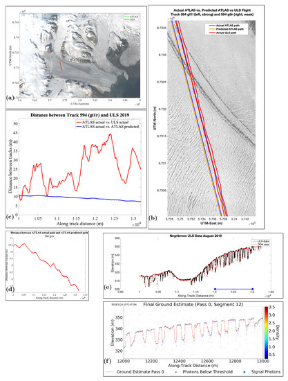 Figure 12 presents the results of RGT 594 with its characteristics surge crevasses, with clear-cut edges, almost regular spacing and depths of 15 m (for details, see [3]). Track separation ranges from 20 m to 80 m with strong fluctuations. As the SkySat image (Figure 12b) and the comparison plot ULS-ICESat-2 indicates, crevasse provinces still line up correctly, which means that crevasses are identified where they exist.