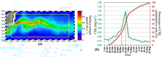 (a) Overall mean (1998–2017) ocean surface current map based on Ocean Surface Current Analysis Real-Time data. The yellow box shows the study region. (b) Example of data showing a temporal variation of chlorophyll-a concentrations (CHL) (green line) from winter to summer 2001 derived from the station (34°N, 144.5°E) indicated by the red box in (a). The red line in (b) is the CHL cumulative sum in percentage relative to the maximum cumulative sum of CHL by the end of August. Blue, red, and green dashed arrows in (b) indicate the dates of the winter CHL minimum, the onset of the spring bloom (percentage of cumulative sum = 30%), and spring bloom peak, respectively.