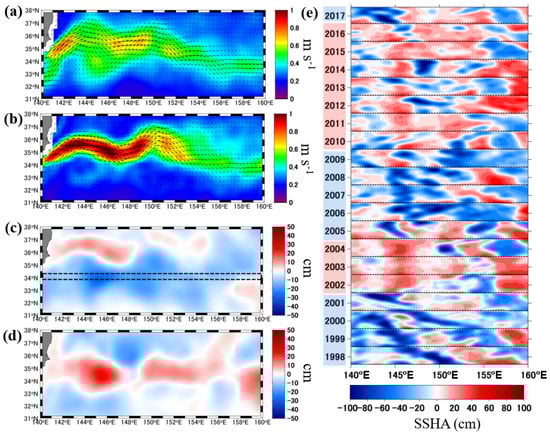 The winter (January–March) ocean surface currents in the study region based on Ocean Surface Current Analysis Real-Time data during the periods of unstable Kuroshio Extensions (KEs) (a) and periods of stable KEs (b). Panels (c,d) are the same as panels (a,b), except they show the sea surface height anomalies (SSHAs). Panel (e) shows the time series (1998–2017) of winter SSHAs averaged within the area indicated by the black dashed box in (c). The labeled years (y-axis) in (e), highlighted by the blue and red colors, are the periods when the KE experienced unstable and stable conditions, respectively.