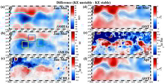 We extracted data from three areas shown in Figure 3 and Figure 4—two areas (yellow and green boxes) south of the KE and one area (blue box) north of the KE—to facilitate visualization in more detail of the mean temporal variations of CHL, SSHA, and MLD from winter to spring (January–April) during the periods of unstable and stable KEs. There is no specific scientific reason for selecting those areas. The two areas (yellow and green boxes) were selected simply because they are located south of the KE and the core areas of negative ΔSSHA, ΔMLD, and ΔSST. One area denoted by a blue box was selected simply because it is located north of the KE and the core area of positive ΔSSHA, ΔMLD, and ΔSST. In the two areas south of the KE, winter CHL during the period of unstable KEs was higher (Figure 5a,c). Shallower MLDs and more negative SSHAs during the period of unstable KE reflected the more frequent cyclonic eddies generated [], westward propagation of negative SSHAs [,], and uplift of thermocline [,] during the period of unstable KEs.